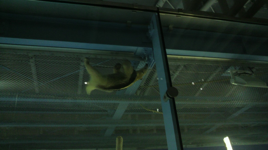 あっちの水槽にはアシカがいるはずなんだが上のほうにいるらしい。